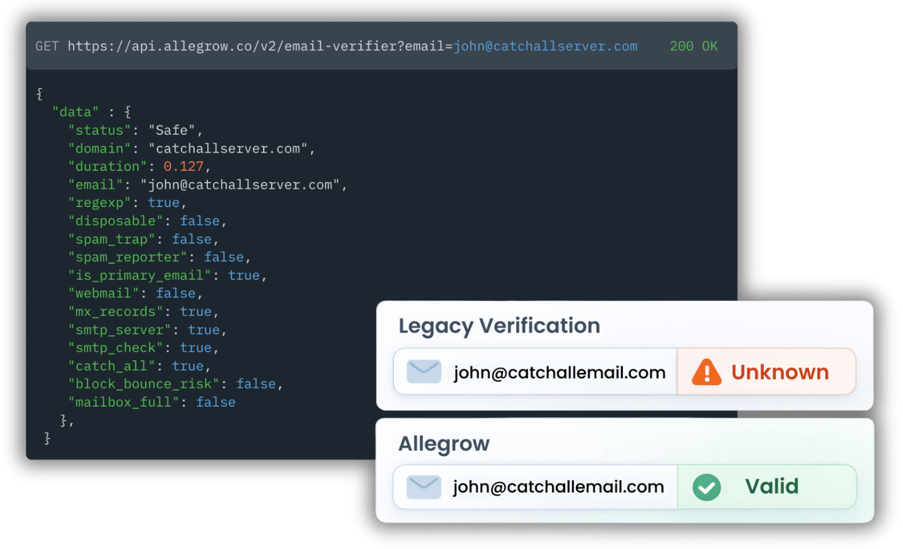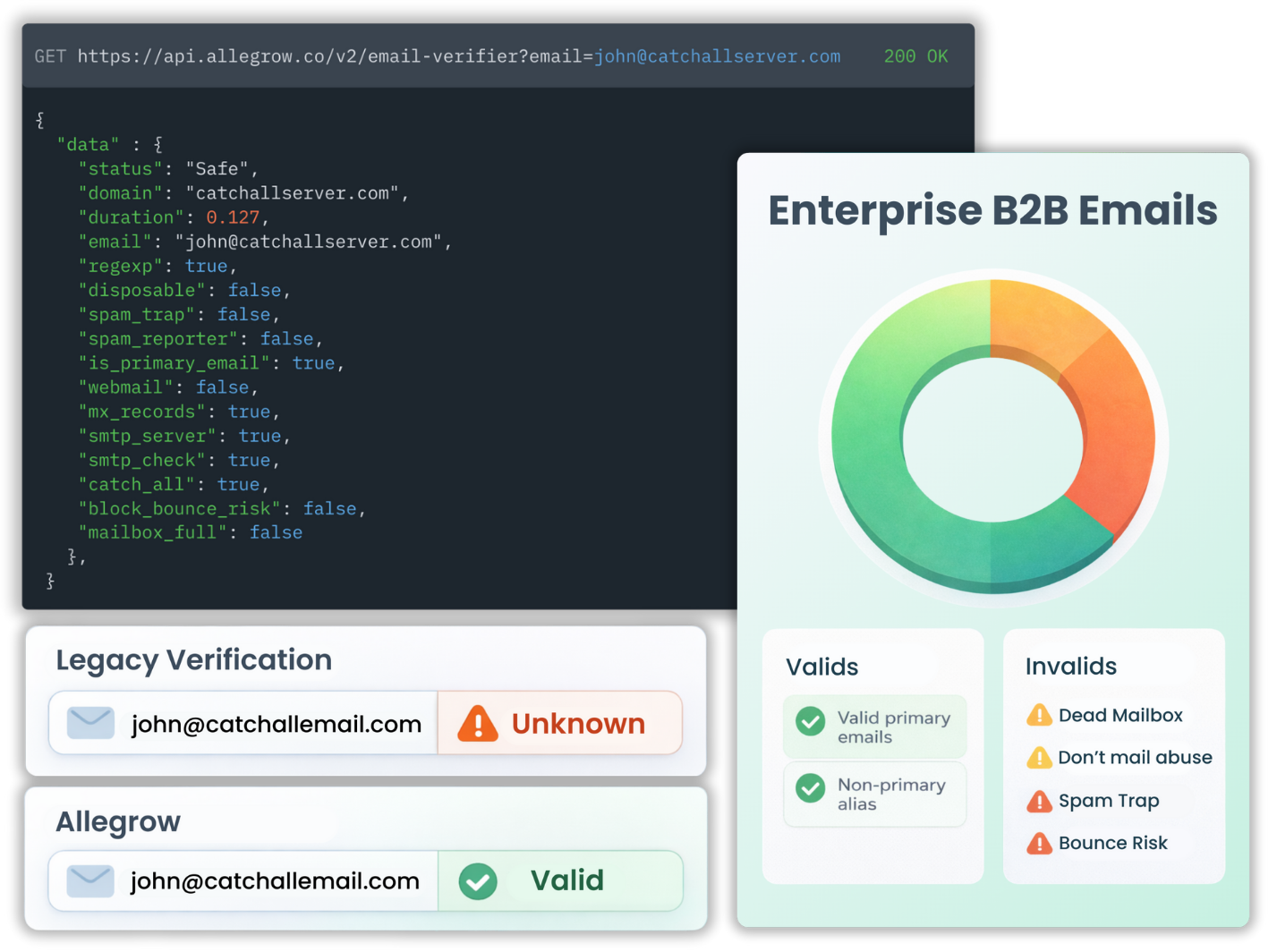 Legacy tools return "Unknown" results on catch-alls and Secure Email Gateways, forcing you to guess which ones are valid. Built for data providers & GTM teams, Allegrow provides conclusive, high-quality results on the valuable B2B contacts others discard. Stop settling for vague risk scores. Verify corporate servers with precision at unlimited scale.