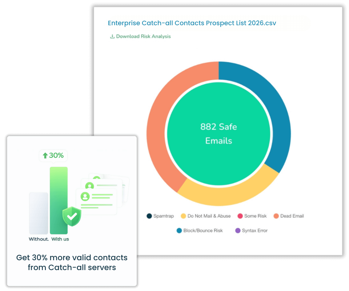 Legacy tools shrink your TAM by marking catch-alls as "Unknown". We provide “Valid/Invalid” statuses where others fail, unlocking 30% more net-new valid contacts with precision, eliminating false negatives.